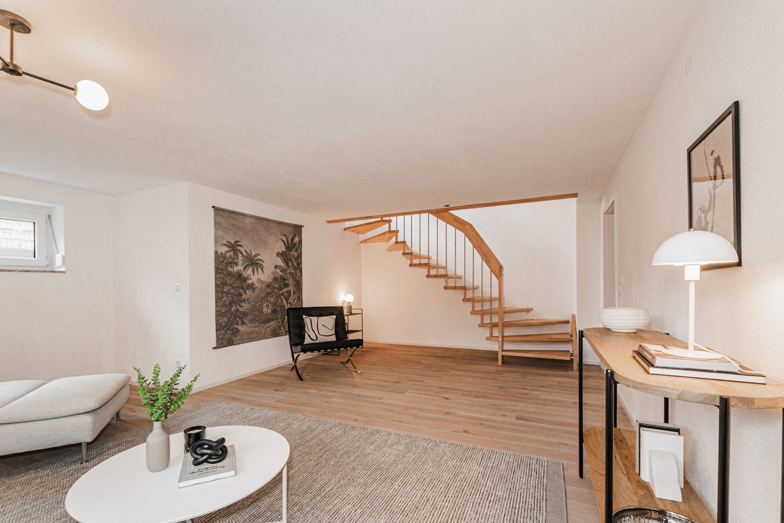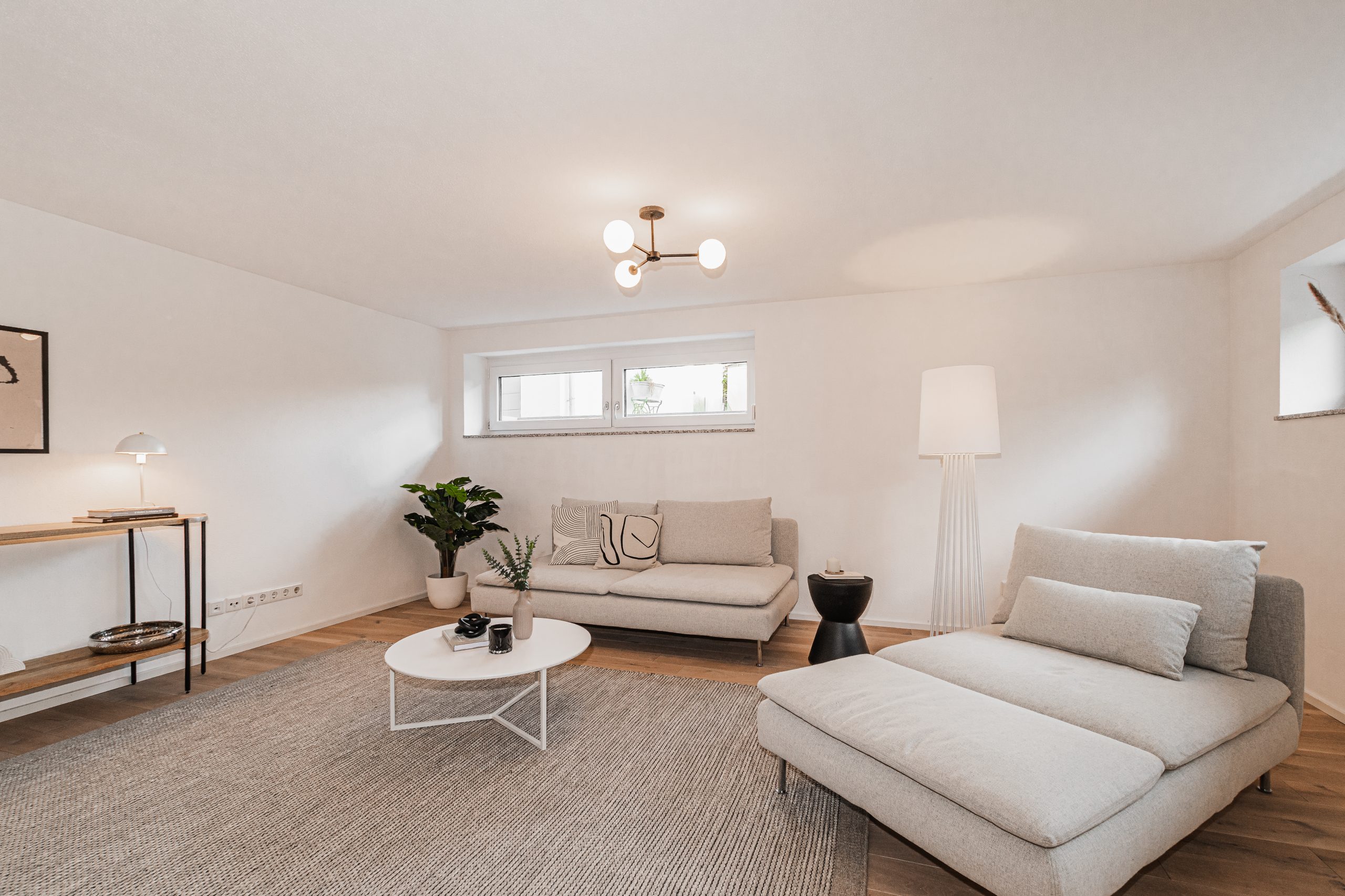 | Herausforderung | Das Objekt war bereits ohne Home Staging erfolglos in der Vermarktung. Für das Wohnzimmer im Souterrain fehlte es den Interessenten an Vorstellungskraft. |