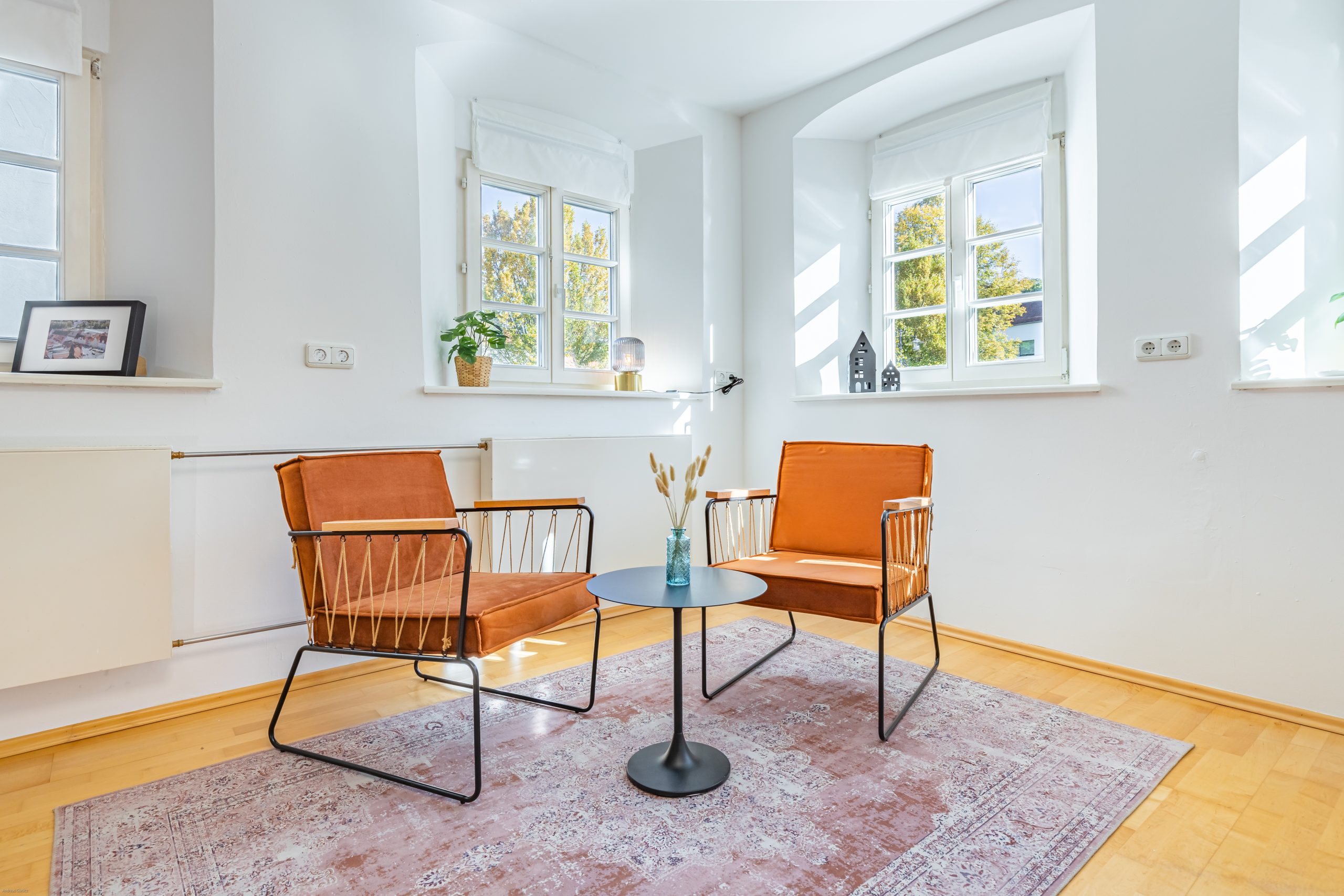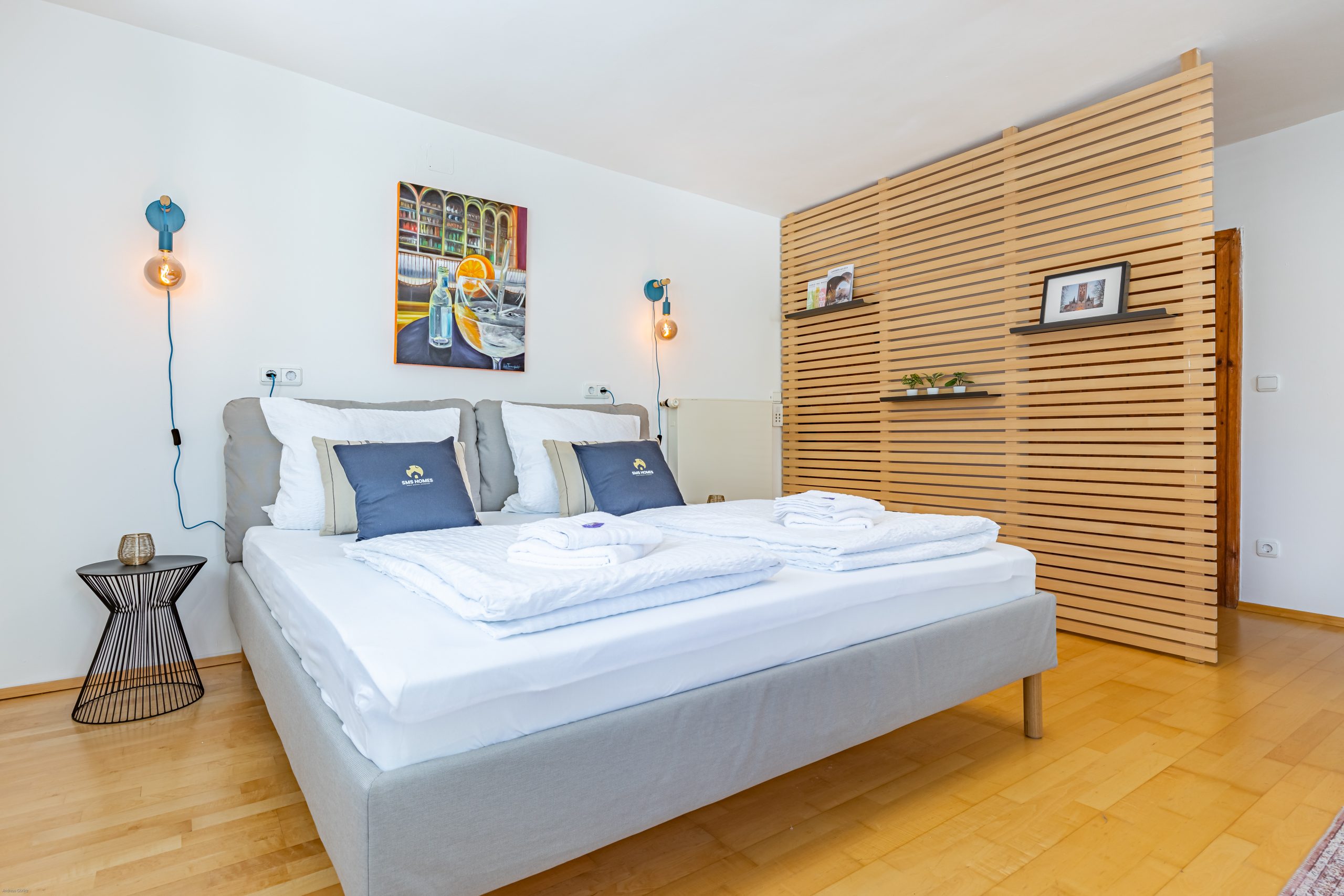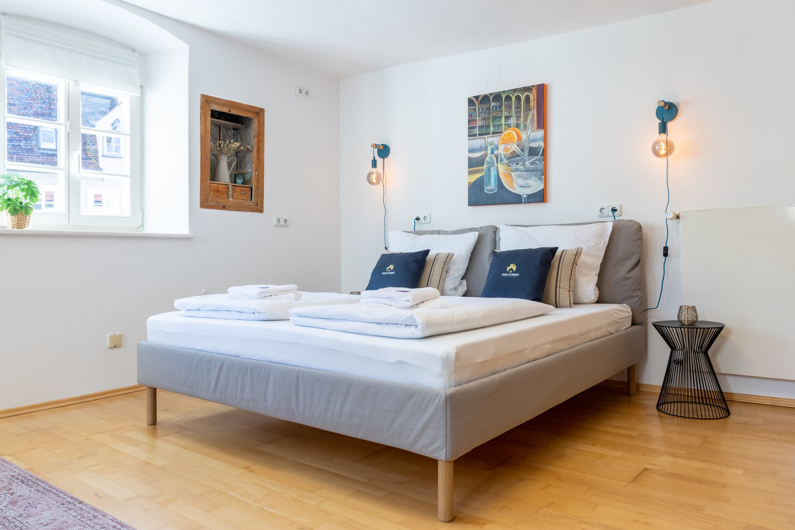 Eine moderne Ferienwohnung auf kleinstem Raum, die den historischen Charme des Hauses wahrt, haben wir in Landsberg auf ca. 35 qm verwirklicht. Blickfang und fröhlicher Farbtupfer ist das Ölgemälde einer lokalen Künstlerin über dem Bett, das die Farbgebung bestimmt.