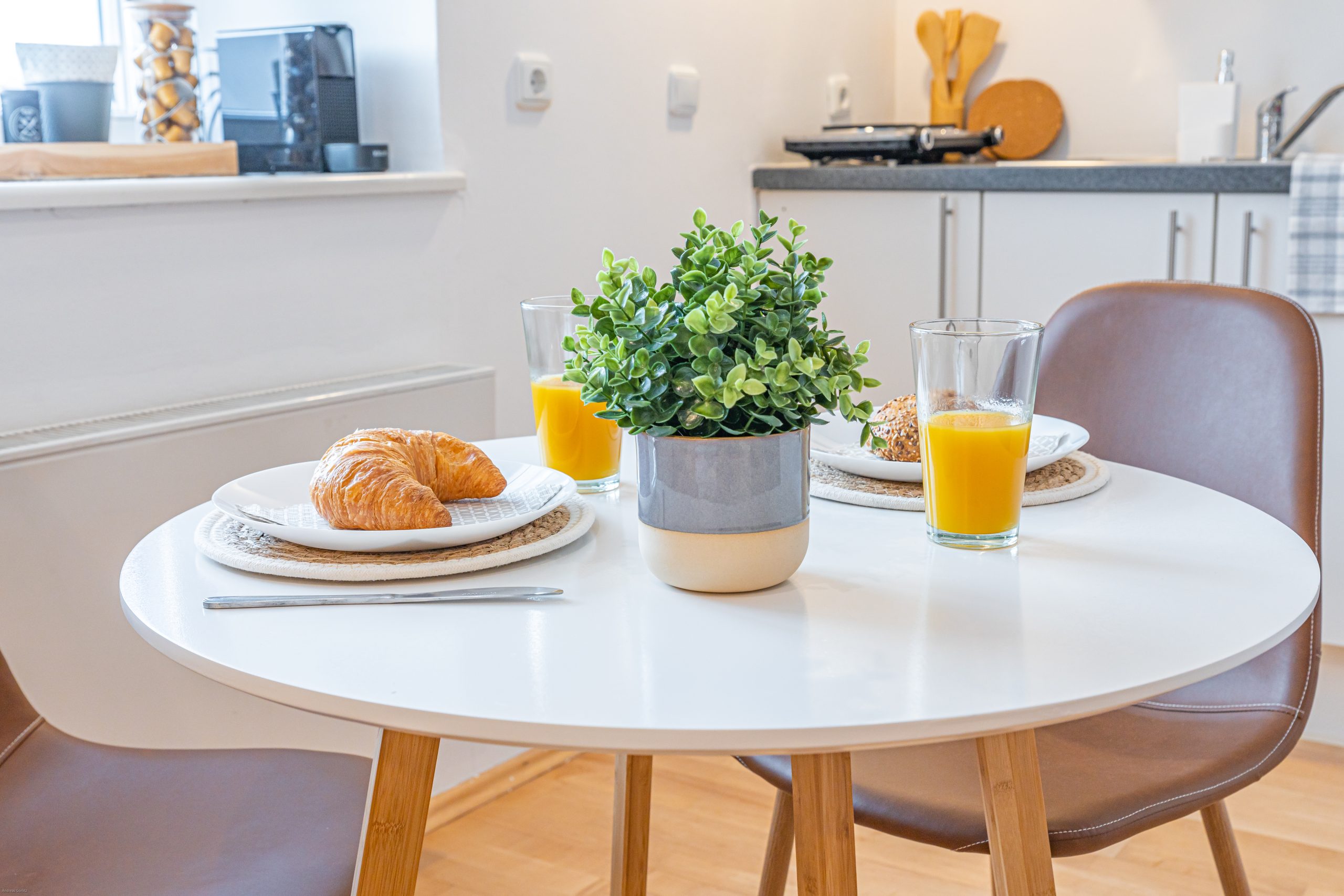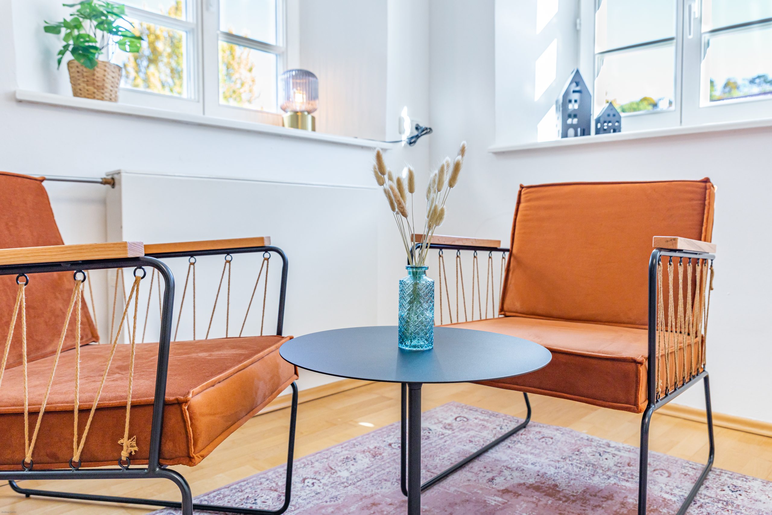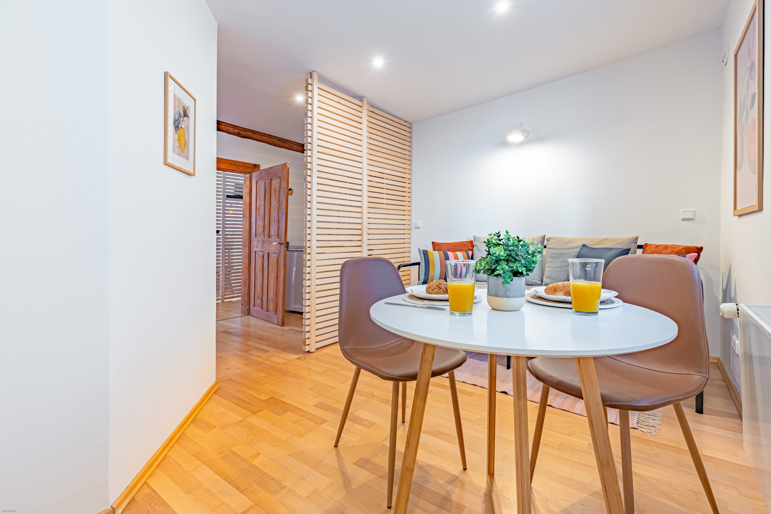 Eine moderne Ferienwohnung auf kleinstem Raum, die den historischen Charme des Hauses wahrt, haben wir in Landsberg auf ca. 35 qm verwirklicht. Blickfang und fröhlicher Farbtupfer ist das Ölgemälde einer lokalen Künstlerin über dem Bett, das die Farbgebung bestimmt.